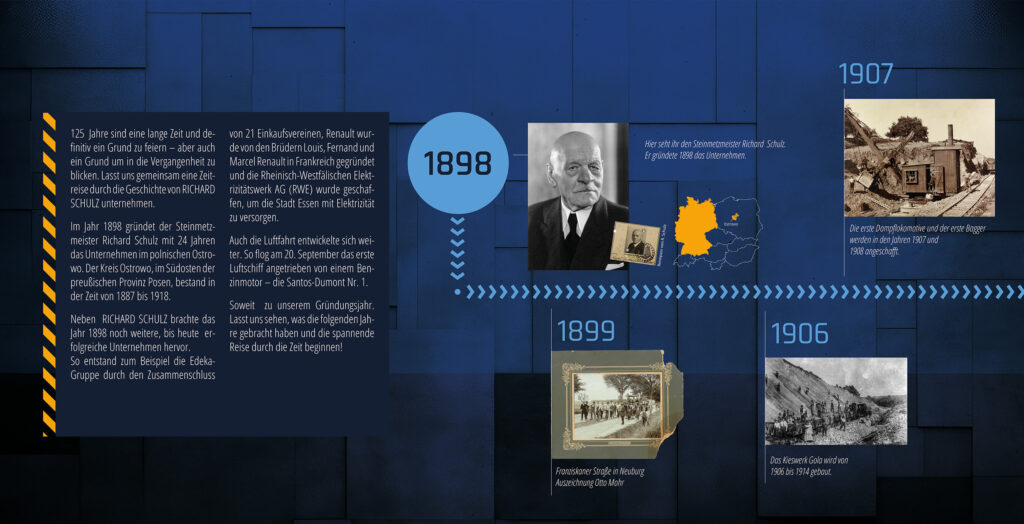 Wir reisen ins Jahr 1898 zur Gründung unseres Unternehmens durch Steinmetzmeister Richard Schulz. Die Etappe führt ins erste Kieswerk und wir entdecken einen besonderen Schatz: Die erste Dampflokomotive und der erste Bagger.