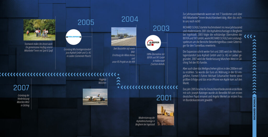 Zudem erweiterten wir unser Leistungsspektrum um die Bereiche Betonfertigteilbau sowie Gitterträger für den Tunnelbau. Dazu kamen weitere Niederlassungen und Mischanlagenstandorte …