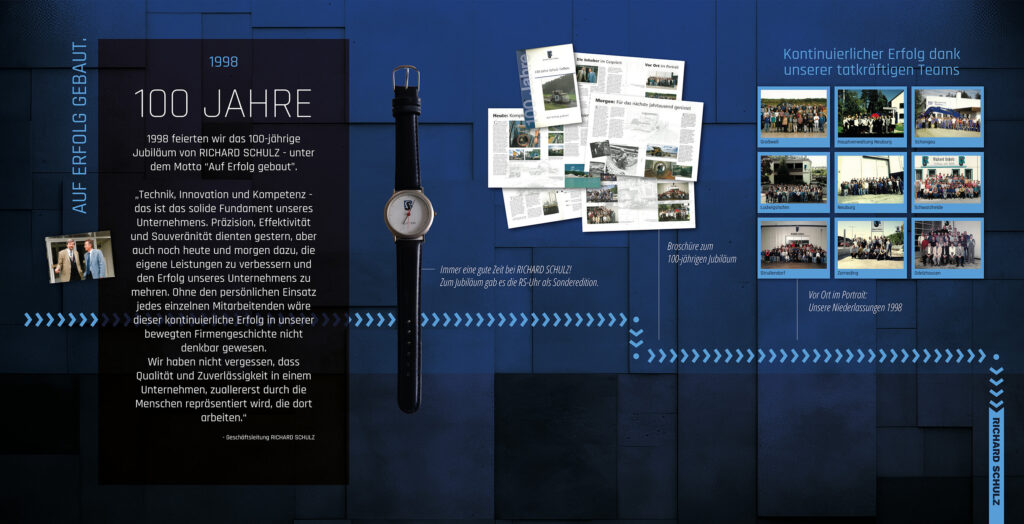 1998 stand schließlich das große Firmenjubiläum „100 Jahre Richard Schulz“ unter dem passenden Motto „Auf Erfolg gebaut“ an. Gemeint waren damit vor allem die Menschen, die hier arbeiten ….